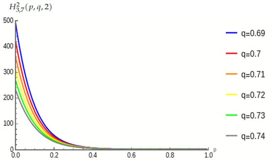 In this section, the numerical behavior of has been analyzed using Mathematica 11.2. Specifically, the independent parameter p is examined within the range for fixed values of and , while keeping q constant for each case. The resulting polynomial behavior of is illustrated in Figure 1. When visualizing q values of , and , it is observed that the polynomial exhibits a higher magnitude for smaller p values and decreases rapidly as p approaches 1.