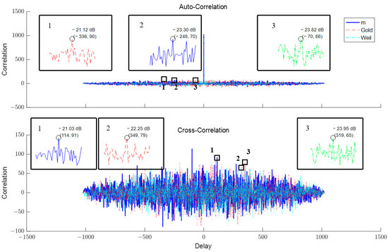 - Xin, Y.Z. Analysis of M-Sequence and Gold-Sequence in CDMA System. In Proceedings of the 2011 IEEE 3rd International Conference on Communication Software and Networks, Xi’an, China, 27–29 May 2011; IEEE: New York, NY, USA, 2011; pp. 466–468. [Google Scholar]