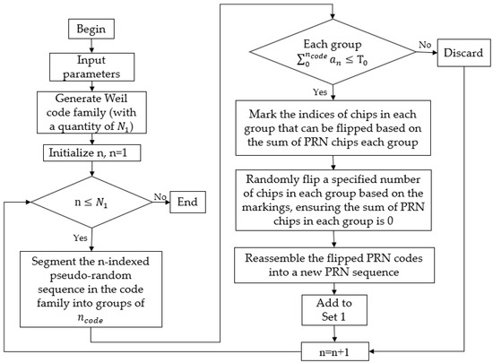 - To minimize the disruption to the characteristics of the original pseudo-random code sequence, perform a preliminary screening of the PRN sequence groups segmented by . The preliminary screening condition is that the absolute value of the sum of PRN chips in each group must be less than or equal to a variable . If the condition is met, proceed to the next step; otherwise, discard the sequence and return to step 3;