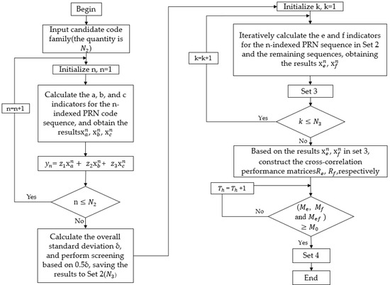 - Compare and with the target code count . If they are smaller than , the target requirement is not met. Increase the cross-correlation threshold by 1 and return to Step 8 for iteration. Repeat until and , then exit the iteration;