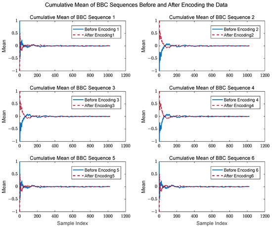 Furthermore, to verify that the BBC sequences can effectively eliminate the DC component during BPSK modulation, random data were encoded into six optimized BBC sequences based on the parameters in Table 3, followed by cumulative mean statistics. The results are presented in Figure 6, which illustrates the cumulative mean before and after data encoding. For a balanced signal, the cumulative mean should approach zero. In the figure, the horizontal axis represents each sample point in the signal, while the vertical axis represents the cumulative mean at each sample point. The six optimized BBC sequences are depicted in blue and red, with solid lines representing BBC sequences without encoded data and dashed lines representing BBC sequences with encoded data. To enhance clarity, the encoded sequences are displayed with inversion. It can be observed that the BBC sequences exhibit consistent trends before and after encoding, with only minor fluctuations near zero. As the sample size increases, the mean rapidly converges to zero, indicating that the sequences are globally balanced, with an average value approaching zero. This demonstrates that the BBC sequences are unaffected by random data, achieve dynamic bit balancing, and effectively eliminate the DC component.