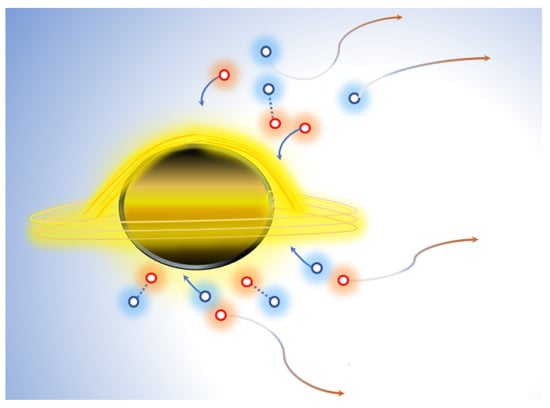 A simple schema of Hawking radiation when some pairs of particles around the horizon are separated, some with negative energy fall into the black hole, and some escape as Hawking radiation. The blue and red colors differentiate the particles of a pair.