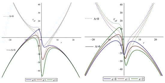 As shown in Figure 2, the effective potential has almost the same behaviors under changes of g and e, decreasing the peaks and immediately through damping (solid)/rising (dotted) for region by increasing the indicated parameters. In the region, by increasing the magnetic charge g, the effective potential also decreases the same as in the region, but the increase in the electric charge e in the region causes growth of the picks and shows an inverse behavior.
