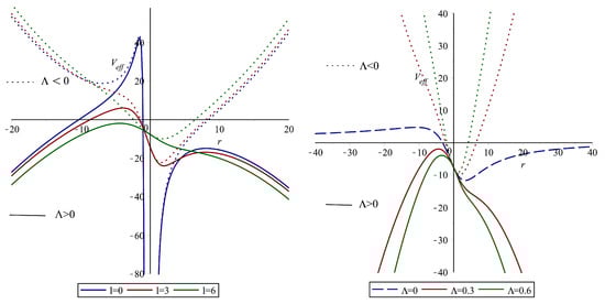 Effective potential of the NRIGP black hole for various NUT parameters l (left) and cosmological constant (right). The solid lines indicate and the dotted ones . The constant arguments are considered as; , and .
