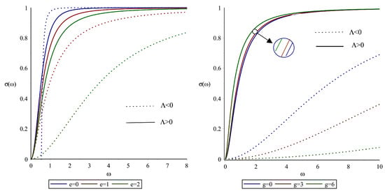 In order to derive in Equation (32), we first determine the by taking the derivative from the effective potential of Equation (27). The direct results of Equation (32) are illustrated in Figure 4 and Figure 5. The greybody factor graphs are depicted for negative cosmological constant (dotted lines) and positive (solid lines) for various parameters such as “, and ”. Depicted in Figure 4 are the behavior of the greybody factor of the NRIGP black hole under the varying of the electric charge “e” (left figure) and magnetic charge “g” (right figure) parameters. The greybody factor is between zero and one, and the closest graph to one means the highest probability of reaching infinity; thus, the case of in has the highest transmission probability. By raising both electric and magnetic charges e and g, respectively, the NRIGP greybody factor starts to decrease in , but by increasing the magnetic charge "g" the greybody radiation also increases very smoothly.