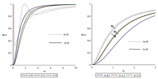 The NRIGP greybody factor under the impression of the NUT parameter l (left) and cosmological constant (right). The solid lines are depicted for , and dotted ones are shown for . The arrow in the dotted graph (right) means increasing and the arrows in the solid ones indicate the greybody factor increase by increasing then after it starts to decrease. The constant parameters are as follows: , and .