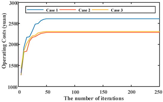 In this paper, we use CPLEX to solve the proposed model. The computing times of Case 1, Case 2 and Case 3 are, respectively, 307.3 s, 422.7 s and 435.1 s. As the uncertainty increases, the computation time becomes longer. The convergence proofs of the proposed method in Case 1, Case 2, and Case 3 are shown in Figure 2. The numbers of iterations in different cases are less than 100.