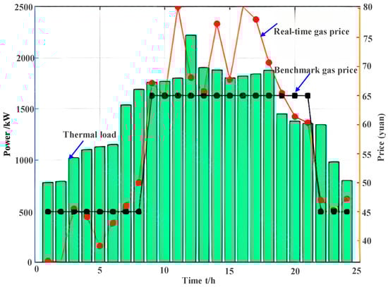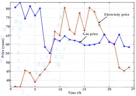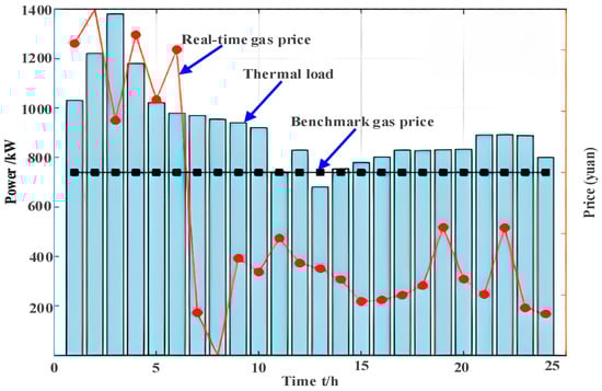 By comparing the electricity and gas prices in Figure 5, it can be observed that during the high peak electricity price period from 9:00 to 18:00, the gas price is relatively low. At this time, the electricity load reaches a high peak while the thermal load is at a low valley. However, during the low valley electricity price period from 22:00 to 7:00, the gas price is higher, and the electricity load is at a low valley while the thermal load reaches a high peak. This is because substitutable loads are taken into account when implementing demand response. Therefore, during high peak electricity price periods, part of the electricity load can be replaced by the thermal load, which reduces the peak electricity load and increases the load during the low valley of the thermal load. Similarly, during periods of high peak thermal load, part of the thermal load can be replaced by the electricity load, reducing the peak thermal load and increasing the load during the low valley of the electricity load, further enhancing the system’s ability for peak shaving and filling.