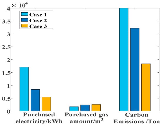 Figure 6 compares the three cases in terms of electricity consumption, gas consumption, and carbon emissions. It can be observed that Case 2 significantly reduces electricity consumption by 8708 kWh compared to Case 1, increases gas consumption by 677 cubic meters, and decreases carbon emissions by 7785 kg. In Case 3 compared to Case 2, electricity consumption continues to decrease significantly by 2984 kWh, while gas consumption slightly increases by 155 cubic meters, and carbon emissions decrease significantly by 13,803 kg. This is because price-based demand response reduces the total electricity and thermal load. Meanwhile, the output of gas-consuming devices increases, which leads to a reduction in purchased electricity and lower carbon emission factors for gas-consuming devices, thus decreasing carbon emissions. During high electricity price periods, the load is shifted to low-price periods and periods with high renewable energy output. Additionally, a portion of the load is reduced, resulting in a decrease in operating costs. The reduction in electricity consumption and increase in gas consumption for IES improve the overall energy utilization efficiency as it relies more on natural gas to meet the load demand. Further analysis is conducted on Case 3.