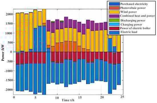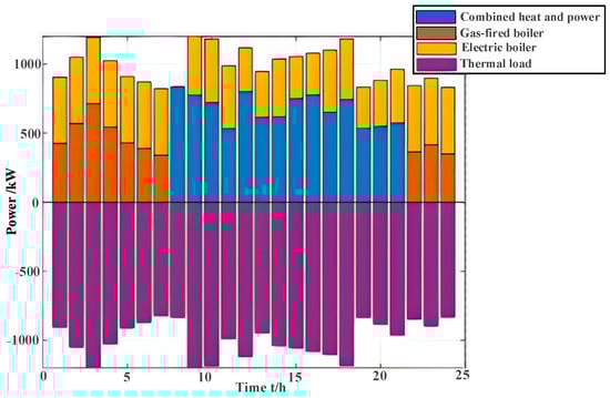 Figure 10 reflects the thermal power balance of IES. During the period from 9:00 to 21:00, the thermal load increases after valley filling. During this time period, the electricity price is higher than or close to the natural gas price. Therefore, the cost of electricity generation from CHP is lower than purchasing electricity. Increasing the output of CHP in the energy supply has advantages. From Figure 8, it can also be seen that during this time period, most of the purchased natural gas is supplied to the CHP. From the graph, it can be observed that during the period from 22:00 to 7:00, there are two factors. Firstly, the electricity price is low and wind resources are abundant during this time period. Secondly, the thermal efficiency of gas boilers and electric boilers is higher than that of CHP. As a result, the CHP have minimal output during this time period, while the gas boilers contribute more to the heating supply. Heating is mainly provided by gas boilers and electric boilers during this time period.