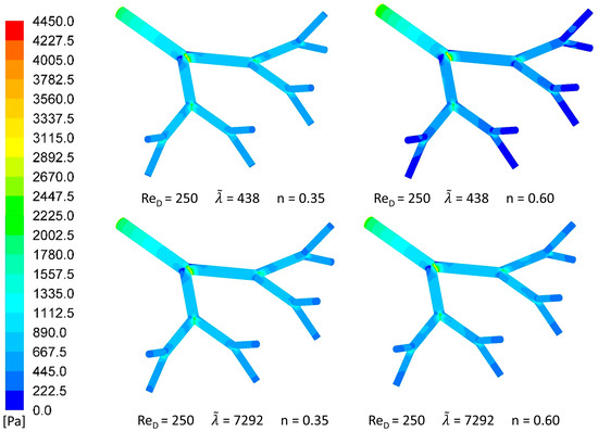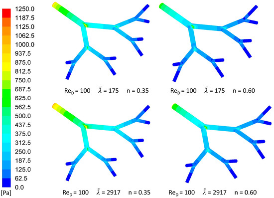 The boundary conditions for the dendritic flow network are as follows: the mass flow rate is prescribed () at the inlet tube and is equal to 0.1639 kg/s and 0.4097 kg/s for non-Newtonian fluid with ReD = 100 and 250, respectively.
