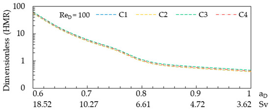 For the structure with aD = 0.6, ReD = 100, and = 175, we obtained a GCI of 2.18%. A necessary parameterization for a quality network is to maintain proportionality between cell sizes and tube diameters. For convergence of the numerical model, the geometry with the smallest diameter ratio and the largest ReD requires sufficiently small and well-distributed cells. The grid configuration has ten hexahedral cell layers in the tube wall (i.e., the layers needed to create an accurate computational domain) with a total of 2.7 × 106 to 5.5 × 106 hexahedral cells.