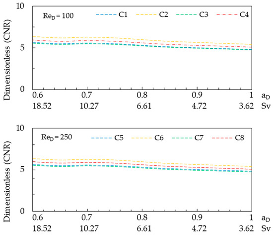In general, the variation in the CNR with the fluid behavior index was more significant than with the Carreau number, which supports the findings shown in Figure 2. It should be noted that as the Reynolds number increased, so did the CNR.