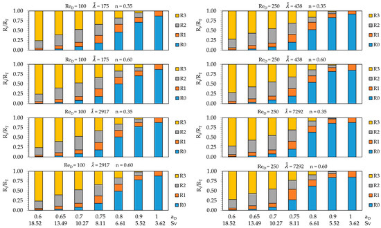 The flow resistance distribution in the dendritic network of the tubes is represented in Figure 6. This figure shows that for the ratio between the diameters from 0.70 to 0.80, the distribution of the flow resistance between the branching levels was more homogenous. Notice also that the branching level 0 had the highest flow resistance for aD > 0.8 and branching level 3 for aD < 0.8. For branching levels 0 and 1, the flow resistance increased with aD, whereas for branching levels 2 and 3, it decreased with aD. Similar results were found with Newtonian fluid flow [3,4], where the flow resistances for branching levels 0 to 3 were not dependent on the Reynolds number. Regarding the variation in rheological parameters for a given diameter ratio, only small variations were observed in the flow resistance.