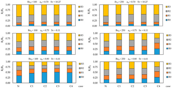 Figure 7 shows the flow resistance distribution for branching levels 0 to 3 as a function of rheological parameters. Notably, there was a near-equality in the Ri/RT ratios between the branching levels for non-Newtonian fluid flow with the same Reynolds number and Carreau number. The smaller the diameter ratio or the higher the slenderness ratio, the more similar the Ri/RT ratios were and the smaller the influences of the rheological parameters.
