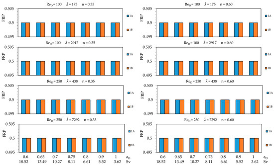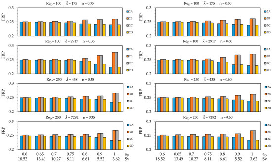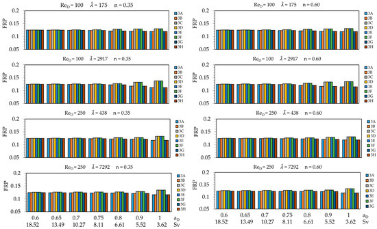Notice that these figures also show that “the tube at level j tube that is aligned with tube level i − 2 carries more fluid than the tube at level i tube that is not aligned with a tube at level i − 2”. As a result, the value of FPR at the level 3 results for tubes A to H were as follows: FPR3A < FPR3B, FPR3C > FPR3D, FPR3E < FPR3F and FPR3G > FPR3H. It is also worth noting that this simple rule also explains and justifies the findings of another research [3,8,9]. It is also important to note that the differences between FRP were more significant for Carreau fluids than for Newtonian fluids. The flow with a higher Carreau number () and lower flow index n tends to transport less fluid at the peripheral tubes.