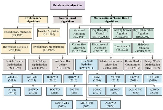 There are numerous varieties of meta-heuristic algorithms; the most popular meta-heuristic algorithms can be divided into three categories: evolution based, mathematics or physics based, and swarm based [24]. Next, a classification of the three most popular meta-heuristics is oriented to present the relevant optimization algorithms, and a summary of the presented methods as well as their hierarchical structure is shown in Figure 1. Evolutionary algorithms (EAs) often mimic biological evolution in nature. Classic EAs include GA, DE, evolutionary programming (EP) [25], etc. EAs approach initial solutions by following one or more natural biological evolutionary processes in some way. To solve optimization problems, the EA typically searches for the optimal solution to a given problem as follows: First, a population of candidate solutions is randomly selected, and its feasibility is determined using a fitness function. Afterward, by repeatedly applying operations and fitness function evaluation, the candidate solution evolves toward the global optimum until the termination condition or the globally optimal solution is found [26]. Mathematical or physical-based algorithms optimize problems by modeling mathematical properties or physical laws. For example, the sine cosine algorithm (SCA) [27], gravity search algorithm (GSA) [28], and ray optimization algorithm (ROA) [29] are based on trigonometric function properties, gravitational interaction, and the law of refraction, respectively. Swarm-based algorithms typically mimic the behavior of social organisms, which is a large and extremely diverse class of meta-heuristics. For example, ACO is an imitation of the way ant colonies search for food. PSO is inspired by the migratory behavior of a flock of birds. Artificial bee colony (ABC) [30] is designed based on the behavior of bee colonies. The GWO [31] is based on grey wolf hunting behavior. A classification of more relevant nature-inspired meta-heuristic algorithms is shown in Figure 1. Many meta-heuristic algorithms have the advantages of high convergence speed and simplicity. However, having high convergence speed and simplicity often leads to loss of diversity and premature convergence. These issues have motivated researchers to develop and investigate new techniques for updating individual positions using a variety of methods to quickly find a feasible solution space, escape the local optimum trap, and deal with the problem of maintaining diversity within a population, as well as facilitating exploration during the exploitation process.