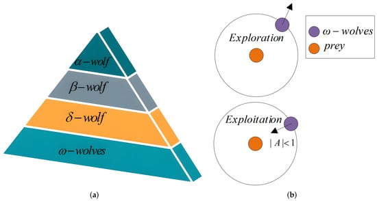 The common belief about wolf packs is that they consist of a group of individuals vying for dominance. However, this is not the case; grey wolves are social animals at the top of the food chain in nature, and to hunt and maintain discipline, they have a very strict social dominance hierarchy [1,61]. It is usually divided into four levels, forming a hierarchical pyramid structure as shown in Figure 2a. The first level is the -wolf, which can dominate or decide the activities of the wolf pack. The second and third levels are -wolf and -wolf, respectively, helping -wolf to make decisions or other group activities. The lowest ranked wolf is the -wolf, which plays the role of the scapegoat and must submit to all other dominant wolves [31].