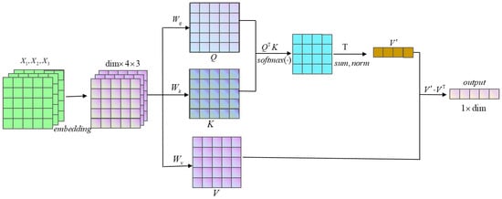 where , , . , , are the parameter matrices of linear mapping, respectively. In this study, is a Gaussian distribution matrix with a mean value of 0 and variance of 1, and and are both unit matrices. Here, the scaled dot product is used as the attention scoring function, so the output vector O can be expressed as