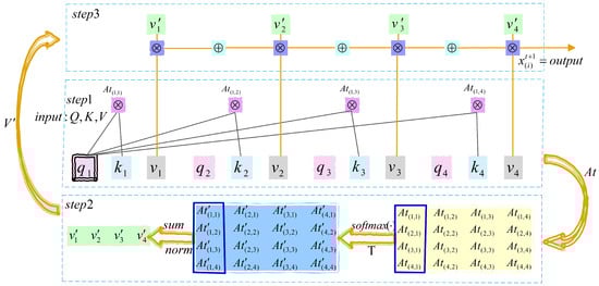 Next, each column vector of the input matrix is linearly mapped to obtain the query vector , and in the same way linearly mapped in and to obtain and , respectively. For example, the specific expression for is as follows: