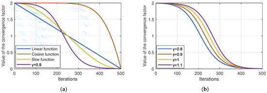 Nonlinear parameter control is an effective strategy to prevent the premature convergence of populations [72,73]. During GWO optimization, the key to obtaining good performance is the balance between exploration and exploitation, and the coefficient vector has a significant effect on this balance [31,42]. However, from Equation (3), it is known that the convergence factor has a direct effect on . In the original GWO, is linearly decreasing from 2 to 0 with the number of iterations, which does not accurately reflect the nonlinear search process [1].