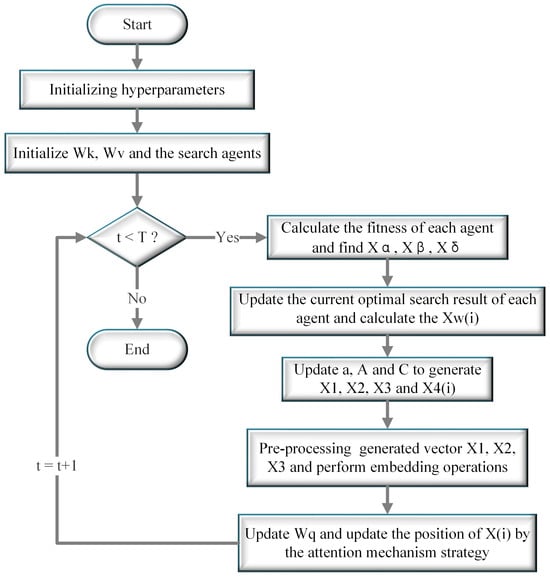 Here, represents the dimension of the vector, and the vectors , , , and are obtained by Equation (6) and Equation (9), respectively, when updating the i-th individual. Similarly, , , , and respectively represent the position vectors of the -wolf, -wolf, -wolf, and -wolf when the i-th individual position is updated. After that, each element of the matrices , is embedded and encoded by Equation (10), and is kept constant. These three matrices are used as inputs to the attention mechanism strategy.