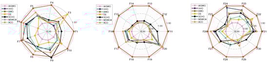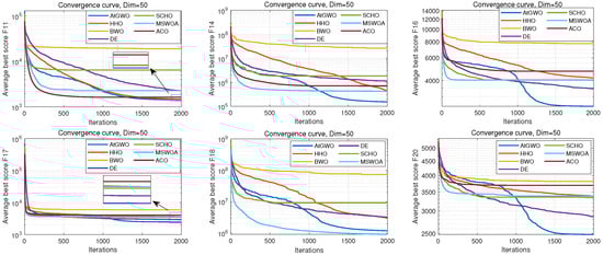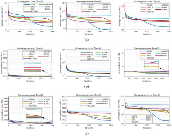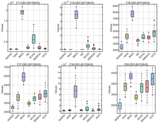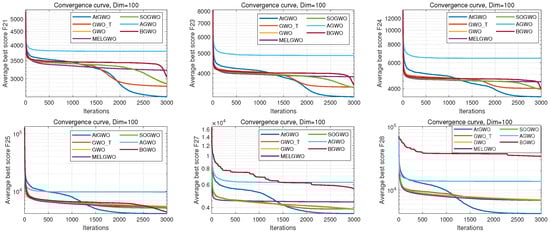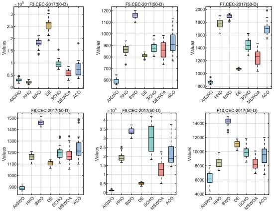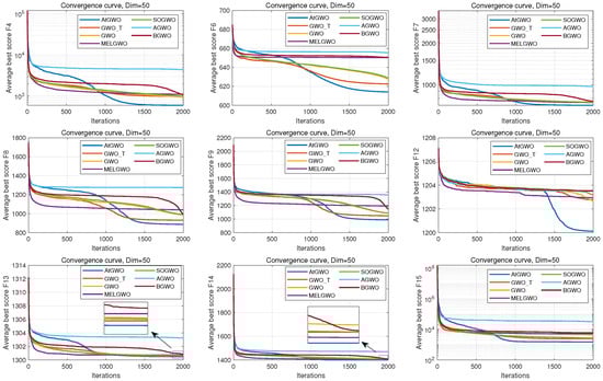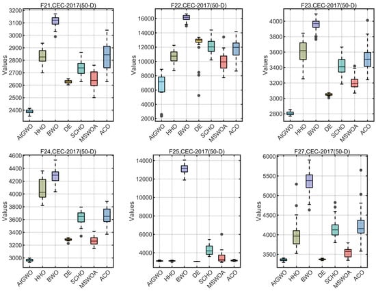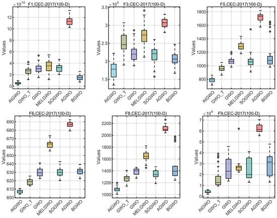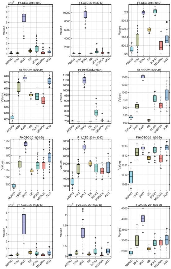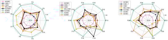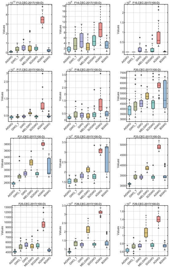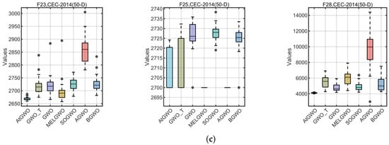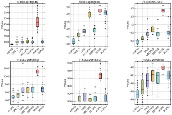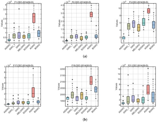In this section, the CEC-2014 and CEC-2017 benchmark functions are tested experimentally. The rationale for the selection of these two test cases is as follows: firstly, these two test benchmark functions are widely used for algorithmic performance testing in, for example, Refs. [26,41,55]. Second, although GWO is simple and easy to implement, its performance in high-dimensional and complex test cases or real-world problems is unsatisfactory, especially in high-dimensional, non-convex multimodal test cases or real-world problems that can easily fall into the local optimum. Therefore, this paper improves the accuracy of GWO in high-dimensional and complex test cases by improving it. Because of the functions of these two test sets and their complexity and multi-dimensional test cases, it is more appropriate to choose them as test cases. In particular, CEC-2014 is a set of benchmark function collections for evaluating and comparing the performance of various intelligent optimization algorithms. The ensemble has a total of 30 test functions, which cover functions for a wide range of challenges in global optimization such as unimodal, multimodal, nonlinear, discontinuous, and high-dimensional properties. The CEC-2017 benchmark functions have 29 functions that have different properties. The set of functions consists of unimodal functions, multimodal functions, hybrid functions, and composition functions. For more reading and information, the reader can read the following references [76].