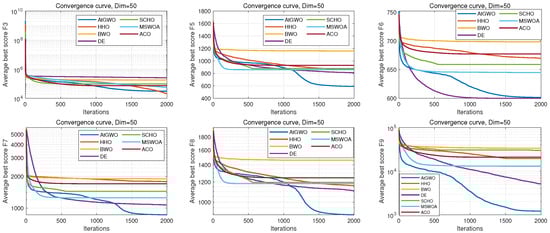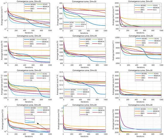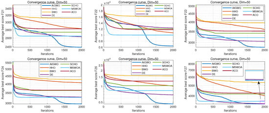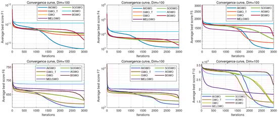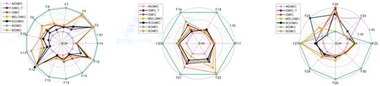 In this section, firstly, the two main reasons for designing the first part of the experiment are presented as follows. One aspect is to verify that the proposed convergence factor based on the hyperbolic tangent function can better control the balance between exploration and exploitation. On the other hand, it is the first part of the experiments carried out on the choice of the AtGWO hyper-parameter (). The validity of the hyperbolic tangent function controlling the convergence factor and the selection of the hyper-parameter is confirmed in this experiment. Except for the difference in the convergence factor function, these seven comparison algorithms all incorporate the attention mechanism strategy and are executed on the same computer configuration. They differ only in the convergence factor function, and the detailed correspondence is shown in Table 5.