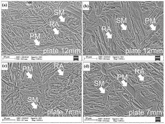 SEM multiphase microstructures after quenching at 240 °C and partitioning at 450 °C: (a) 300 s (plate 12 mm), (b) 900 s (plate 12 mm), (c) 300 s (plate 7 mm), and (d) 900 s (plate 7 mm). PM—primary martensite; SM—secondary martensite; RA—retained austenite.