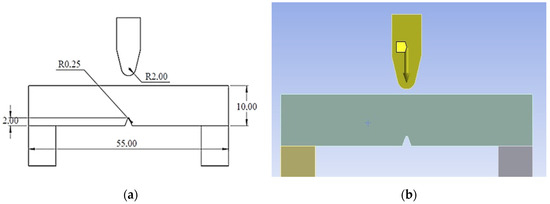 Charpy impact specimen: (a) ISO 148-1 dimension and (b) modeling setup in the ANSYS software.