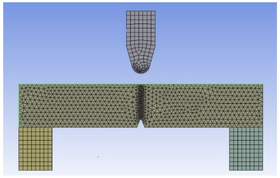 After performing the mesh sensitivity analysis, the 0.25 mm mesh size was set in the middle area of the sample and to the striker tip, while a mesh size of 0.5 mm was used for the remaining areas, as illustrated in Figure 4.