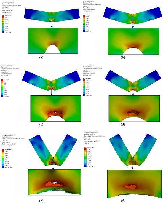 Stress distribution and cracking over time: (a) 0.1 mm notch radius specimen at 0.001 s, (b) 0.25 mm notch radius specimen at 0.001 s, (c) 0.1 mm notch radius specimen at 0.002 s, (d) 0.25 mm notch radius specimen at 0.002 s, (e) 0.1 mm notch radius specimen at 0.007 s, and (f) 0.25 mm notch radius specimen at 0.007 s.