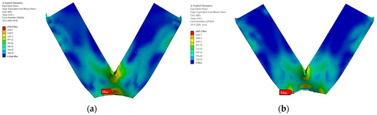 In the Charpy impact simulation, the stress distribution changed dynamically, exhibiting increased stress intensity during the impact phase due to transient stress waves and strain rate effects. The stress was initially more concentrated near the notch tip, spreading throughout the specimen as the material absorbs energy. In contrast, after the end of the simulation, the stress became localized, particularly around the fracture areas, indicating residual stress states after the completion of energy absorption. Studies showed that stress became concentrated around fracture areas after simulation, indicating residual stress states [59,60]. The lower notch radius resulted in increased stress concentration both dynamically and residually, while the higher notch radius facilitated a more uniform stress distribution, thereby reducing maximum stresses [61]. These differences indicated the material’s dynamic toughness at impact and its residual strength after the loading event. At the end of the simulation, the specimen had absorbed the impact energy, and the stress distribution represented the residual stress condition. The numerical results depicted that a specimen with a 0.1 mm notch radius resulted in a higher equivalent (von Mises) stress of 1753 MPa compared with 1605 MPa with a 0.25 mm notch radius, as shown in (Figure 7a,b).