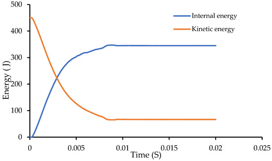 The Charpy impact test is a standard method for assessing a material’s ability to absorb energy when subjected to impact loads. During an impact test, the kinetic energy of the impactor is transferred to a specimen and absorbed as internal energy, as shown in Figure 8. The absorbed energy depends on many factors discussed in Section 1. According to the simulation results, the energy absorbed increased with the plate thickness. The increase in the plate thickness allowed the material to endure more strain before fracturing, resulting in greater energy absorption. Thus, increasing the plate thickness from 7 to 12 mm resulted in approximately a 12–14% increase in energy absorption for the samples. Mitchell et al. [62] studied X70 pipeline steel and found that the 22 mm plate had higher toughness than the 13.5 mm plate. However, sometimes the transition from ductile to brittle was more pronounced in thick plates due to increased constraint effects, producing a tendency for brittle fracture.