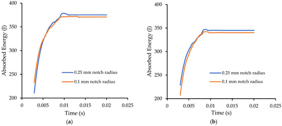 Figure 8 and Figure 9 show that energy absorption reached a maximum just before the fracture point in the plastic deformation region, and no further increment occurred. Seo et al. [66] have noted that during a Charpy impact test, a significant portion of this energy is associated with plastic deformation of the specimen.