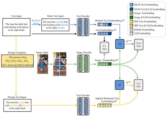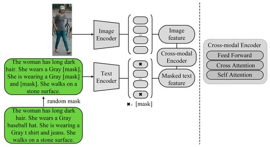 Although the above methods are effective in matching visual and textual attributes, they are limited in achieving a deeper comprehension of image and text features within the model. Masked Language Modeling (MLM) [] was initially used in natural language processing to enhance a model’s understanding of language by predicting masked words. For example, BPDec [] combines gradual unmasking attention and MLM to enhance language comprehension, while NextLevelBERT [] applies MLM at the text embedding level to optimize long document processing. Consequently, MLM is extended to text-based Re-ID tasks to enhance the model’s understanding of text. Jiang et al. [] designed an innovative method combining implicit relational reasoning and MLM for the prediction of masked text tokens, using visual cues and unmasked textual content. By optimizing the correspondence between the contextual representations of image–text pairs and the static embedding associated with the masked text tokens, the method implicitly and autonomously utilizes the fine-grained local information to establish precise alignments between image features and text descriptions. However, this method performs only local matching from image to text, thus failing to fully utilize the local alignment information between image and text. Based on the study in [], Fujii et al. [] introduced text-to-image local matching and designed a bidirectional local matching framework. The text-to-image local alignment information is further extracted by randomly masking image regions and generating semantic labels for the masked regions using a pre-trained human parsing model.