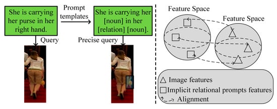Through the MLM module, the model gains a comprehensive understanding of the semantic alignment information between image regions and text attributes. To further leverage the potential of pedestrian attributes, we next explore the implicit relationship between these attributes. Previous studies have often overlooked the rich semantic relational details embedded in both image and text attributes, which are crucial for improving pedestrian retrieval accuracy. Figure 3 illustrates an implicit “carrying” relationship between the attributes “left hand” and “wallet”. By utilizing this relationship, the module aligns the implicit relational prompt features with image features, enabling the model to focus on specific regions and improve the precision of the query.