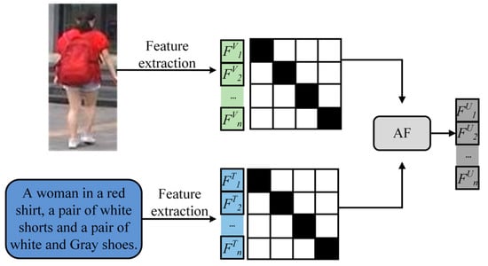 Typically, images and texts depicting the same pedestrian identity contain complementary information, and the semantic features extracted from them are, likewise, complementary. With the MLM and IRP modules, the model is able to learn attribute information in images and texts from different perspectives. To fully leverage this information, we draw upon the concept of multimodal feature fusion [] and employ AF [], while innovatively designing the SSF module, as shown in Figure 4. The feature fusion process combines image and text features, resulting in a more comprehensive semantic representation.