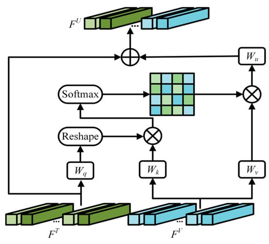 The feature fusion process is as follows: Let the image features be represented by and the text features by . First, the text features are transformed into Query via the fully connected layer , while the image features are processed into both Key and Value through the fully connected layers and , respectively. Next, the attention weights matrix is derived from the softmax normalized dot product of and , indicating the significance of each text feature relative to the image features. The weighted image features are then computed by multiplying with , followed by a transformation through the output fully connected layer . Finally, the fused features are obtained by adding the transformed weighted image features to the original text features . This integration enhances cross-modal performance by leveraging the complementary information from both modalities. As a result, the SSF module effectively integrates features across different modalities, mitigating the semantic disparities between image and text during cross-modal matching. The architecture of the AF network is shown in Figure 5.