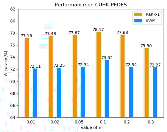 Consistent with state-of-the-art advanced text-based Re-ID methods [,,], we conduct experiments using the PyTorch deep learning framework for both training and testing, leveraging an NVIDIA GeForce RTX 3090 GPU (NVIDIA: Santa Clara, CA, USA, Sourcing City: Shanghai, China). The backbone network utilizes a pre-trained CLIP-ViT-b/16 as the image encoder and a pre-trained CLIP text Transformer as the text encoder. The image resolution is set to and data augmentation techniques, including random flipping, cropping, and image erasure, are applied during training. The maximum sequence length of the textual token is limited to 77. Both the pedestrian image feature vector and the pedestrian text feature vector have a dimensionality of 512. The model is trained over 60 epochs using the Adam optimizer [], with the number of mask and prompt tokens set to 3. The initial learning rate is set to , with cosine decay applied for weight adjustment. A warm-up strategy is used for the first 5 epochs, gradually increasing the learning rate from to . To ensure experiment reproducibility, the random seed is fixed at 22.