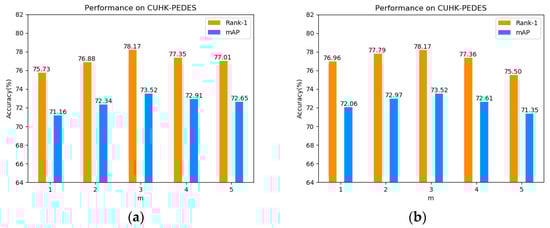 Our experiments show that the model achieves optimal performance when and . We also explored nearby combinations on the CUHK-PEDES dataset, and Figure 9 clearly illustrates the complex, nonlinear relationship between and , which significantly affects the model’s performance. Therefore, all experiments in this paper adopt the optimal settings identified in this subsection.