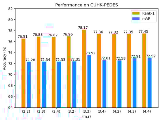 Effect of different combinations of and number on model performance on CUHK-PEDES.