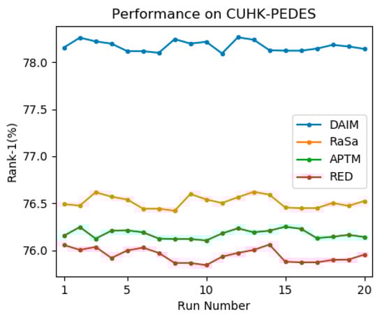 To comprehensively evaluate the model’s performance, we independently conducted 20 runs of DAIM and state-of-the-art methods on the CUHK-PEDES dataset. The Rank-1 results are presented in Figure 10. As shown in Table 8, we assessed the Rank-1 values by calculating the standard deviations, confidence intervals (CIs), and mean ± standard errors, providing a detailed analysis of the model’s reliability.
