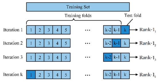 To evaluate the model’s stability, we employ the -fold cross-validation method with . As depicted in Figure 11, the dataset is first split into equally sized subsets. In each iteration, one subset is designated as the test set, while the remaining subsets are combined to form the training set. The Rank-1 value for each fold is recorded, and the overall Rank-1 value is then calculated using Equation (14).