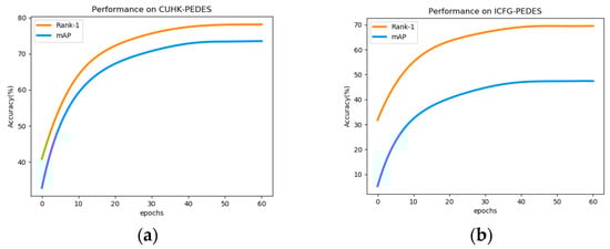 (a) Changes in Rank-1 and mAP changes across epochs on the CUHK-PEDES dataset; (b) changes in Rank-1 and mAP across epochs on the ICFG-PEDES dataset.