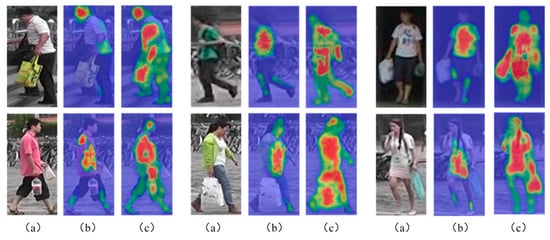 (a) The original pedestrian image; (b) the heat map of Baseline; (c) the heatmap of DAIM.