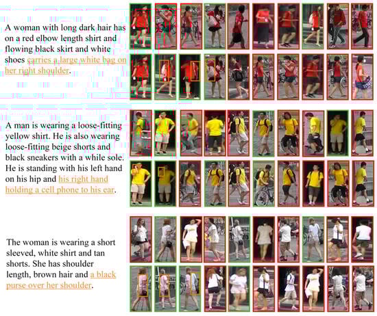 In this paper, the model was evaluated on text-based Re-ID datasets: CUHK-PEDES [], ICFG-PEDES [], and RSTPReid []. A summary of the descriptive information for these datasets is provided in Table 2.