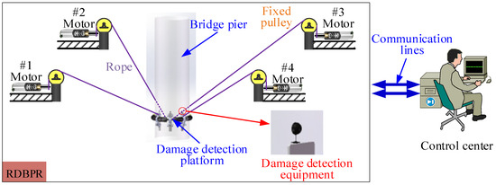 The RDPR platform consists of four groups of rope drive units installed on the bridge deck, where one end of the rope is connected with the damage detection platform and is fixed, and the other end of the rope is connected to the drive wheel mounted on the motor through a guide pulley. According to the control commands sent by the control center, four motors drive the drive wheels to realize the control of the expected motion of the rope and the rope tension force. The expected motion of the damage detection platform can be realized through the coordinated motion of the four groups of ropes and the rope tension control, and then, the damage detection task of the bridge pier is realized by utilizing the damage detection equipment.