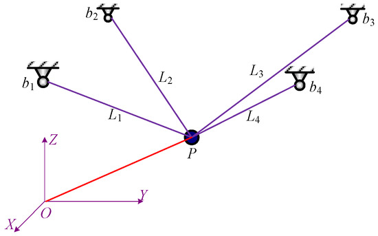 The designed RDBPDR is a special rope-driven parallel robot (RDPR). Compared with the overall structure of the RDBPDR, the structure size of the damage detection platform is small. It can be regarded as a point, denoted by P. Meanwhile, compared with the mass of the damage detection platform, the selected rope mass is small and can be ignored, so the curvature caused by the weight of the rope can be neglected. Therefore, the geometric shape of the rope in the actual motion process is a straight line. At this time, the RDBPDR shown in Figure 1 can be simplified as the theoretical analysis model shown in Figure 2.