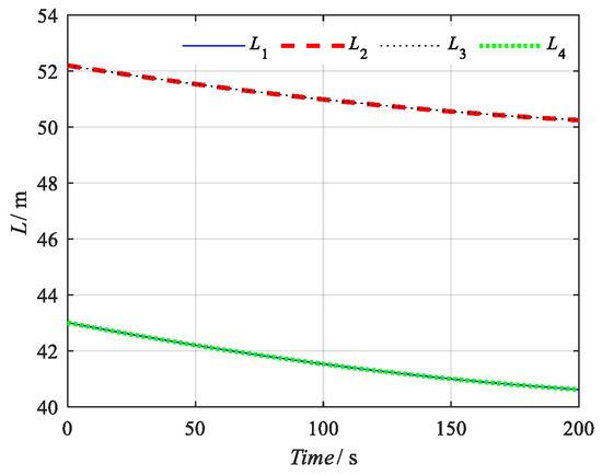 It is assumed that the position of the bridge pier detected in O-XYZ is (30, 40, z) m, and the height of the bridge pier is 10 m. The trajectory of the damage detection platform in the Z direction is z = 0.05 t m/s. The trajectory of the damage detection platform (the red line) is shown in Figure 3. It can be seen from Figure 3 that the position in the horizontal section of the bridge pier is not in its geometric center, and the position is close to its boundary. The changes in the rope length and the rope tension corresponding to the expected trajectory are shown in Figure 4 and Figure 5, respectively.